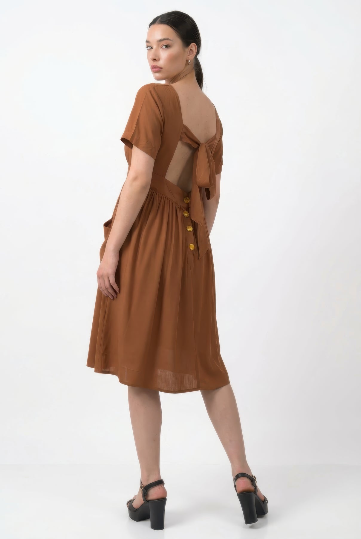 Be the epitome of style and modernity with our Yasmine Midi Dress, a wardrobe essential designed to make you look and feel fabulous. This dress features a stylish V-neckline and a sophisticated bare back adorned with a tie, enhancing your chic appeal. It also has two functional front pockets for added convenience and functionality. Whether you're attending formal gatherings, church services, special occasions, or dinner dates, this piece is your go-to choice! Pair it with your favorite accessories and shoes, and you're good to go! Available from small to large sizes.